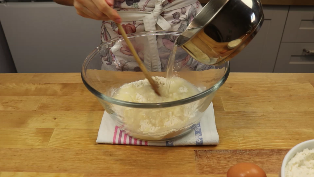 Тим часом у миску, де замішуватиму тісто, всипаю приблизно 5 ст. л. борошна. Вливаю гарячу воду і вимішую до однорідного тіста, щоб не було грудочок.