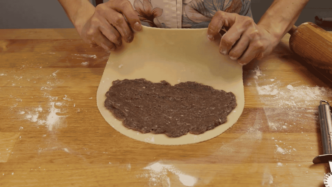 На половину тіста ставлю 1 ст. л. фаршу, з гіркою. Розрівнюю як на фото, не доходячи до краю на 5…7 мм.