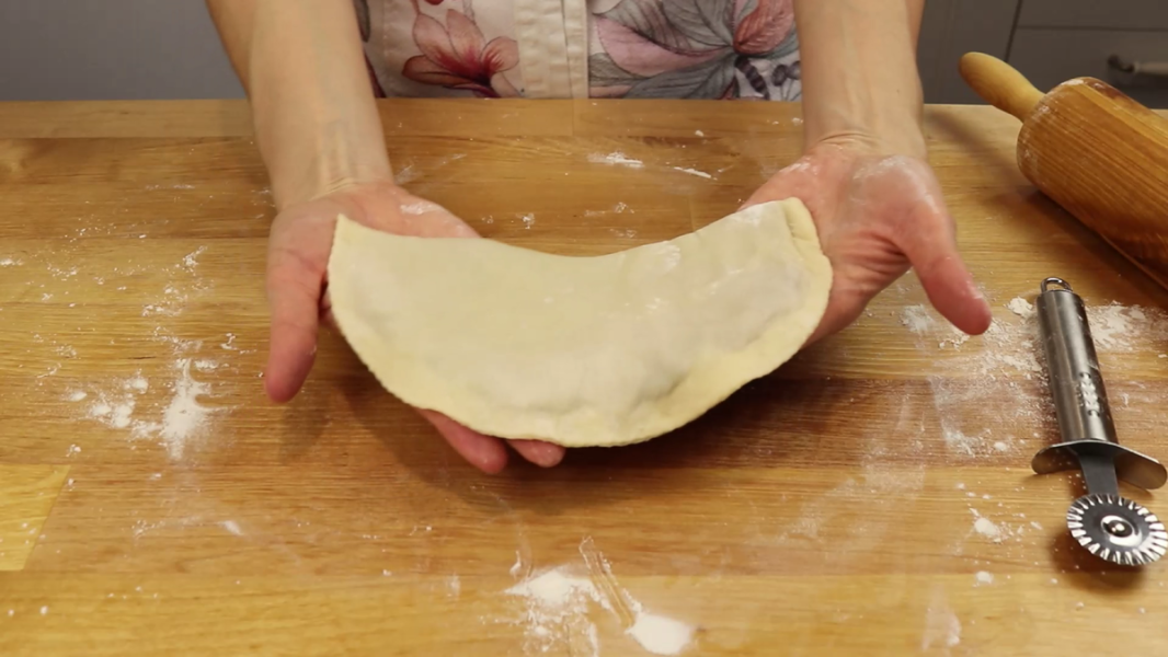 Накриваю другою половиною тіста, притискаю, щоб видавити повітря. Добре защипую краї. Можна підрізати фігурним ножем.