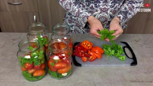 Помідори наколюю зубочисткою – роблю кілька наколів і укладаю до середини банки. У низ викладаю помідори по крупніше, а зверху поменше розміром.