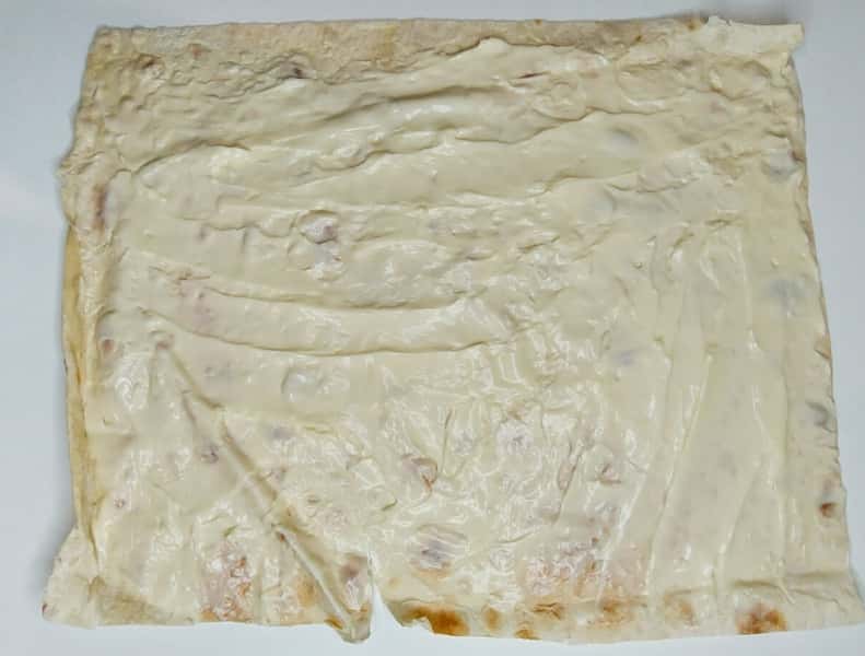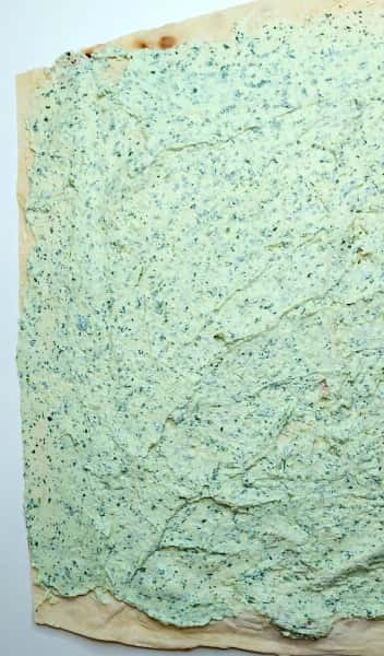 3. Лаваш розміром 50 на 40. Нерівні краї підрізати. Поступово розподілити сирну масу по всьому лавашу, залишаючи місце з боків 1 см.