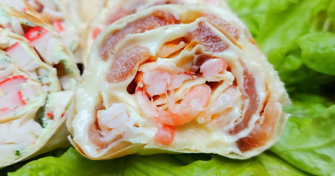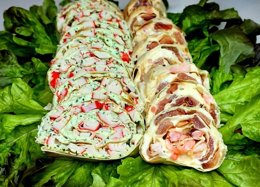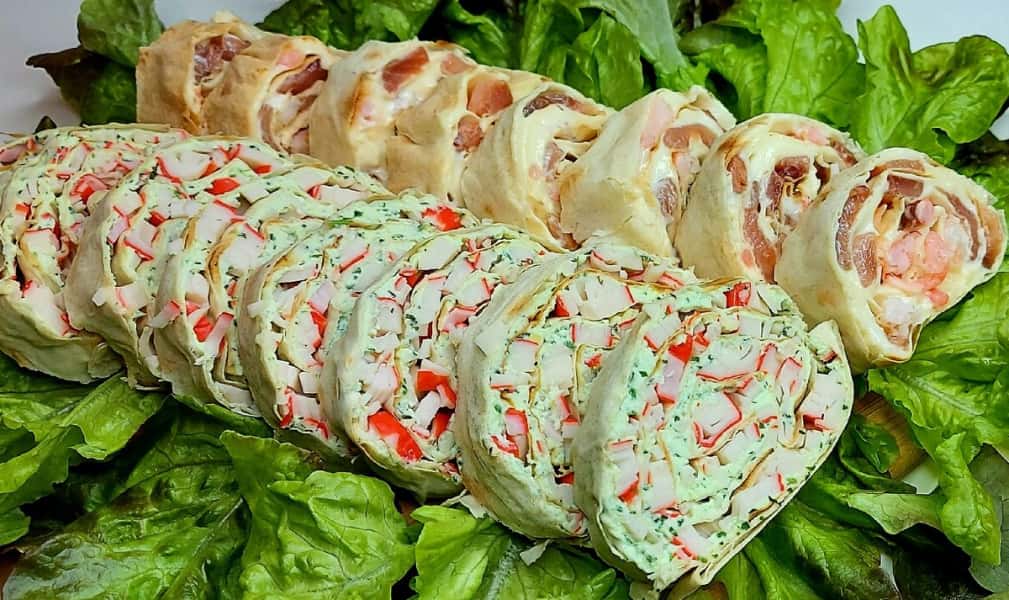 Закуска з лаваша та двох видів начинок. Швидко та смачно! Особливо порадують роли з начинкою з слабосолоної горбуші та креветок.
