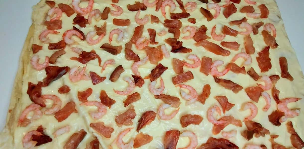 4. Зверху рівномірно розкласти шматочки риби та креветки.