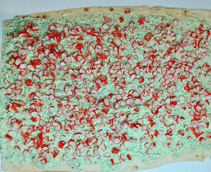 1. Лаваш розміром 40 на 30. По всьому лавашу рівномірно розподілити вершковий сир, залишаючи місце по 1 см з боків.
