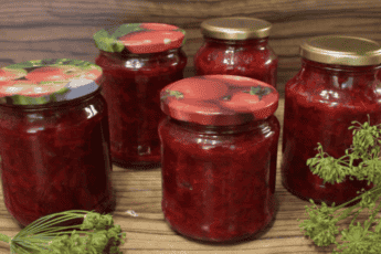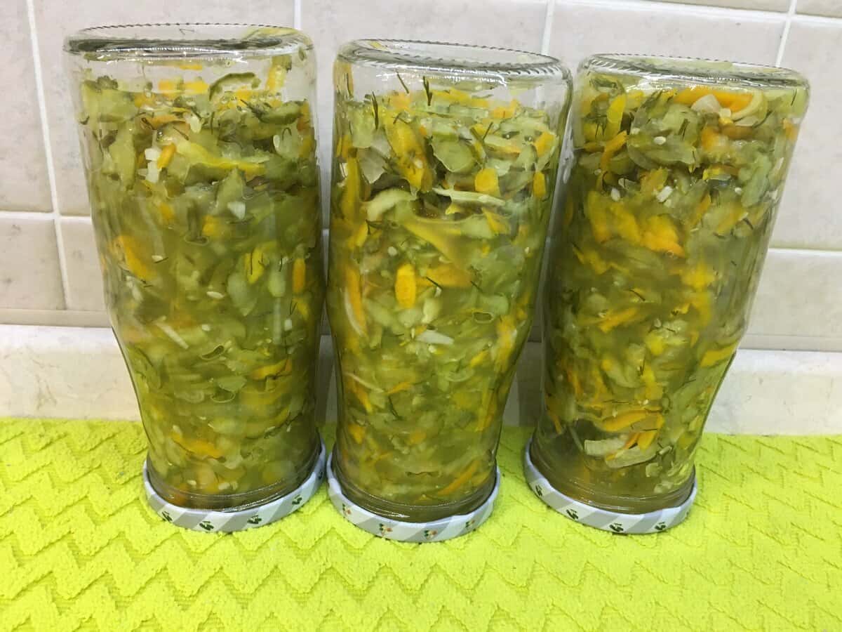 Розкладаю гарячу закуску в гарячі стерильні банки, закупорюю, перевертаю на кришку і накриваю “шубою” до охолодження мінімум на 1 добу. Потім прибираю на зберігання.