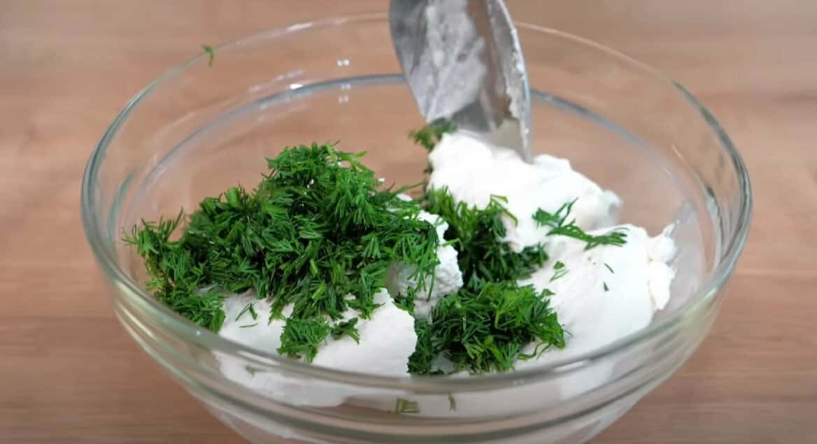 Сир змішуємо з зеленню, часником і ложкою йогурту ( типу грецького ). Можна замінити сметаною. Трохи підсолюємо.