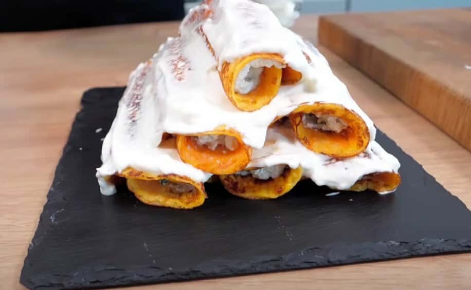 Наповнюємо начинкою млинці і звертаємо їх в трубочки. Викладаємо трубочки пірамідкою, змащуючи кожен шар йогуртом.