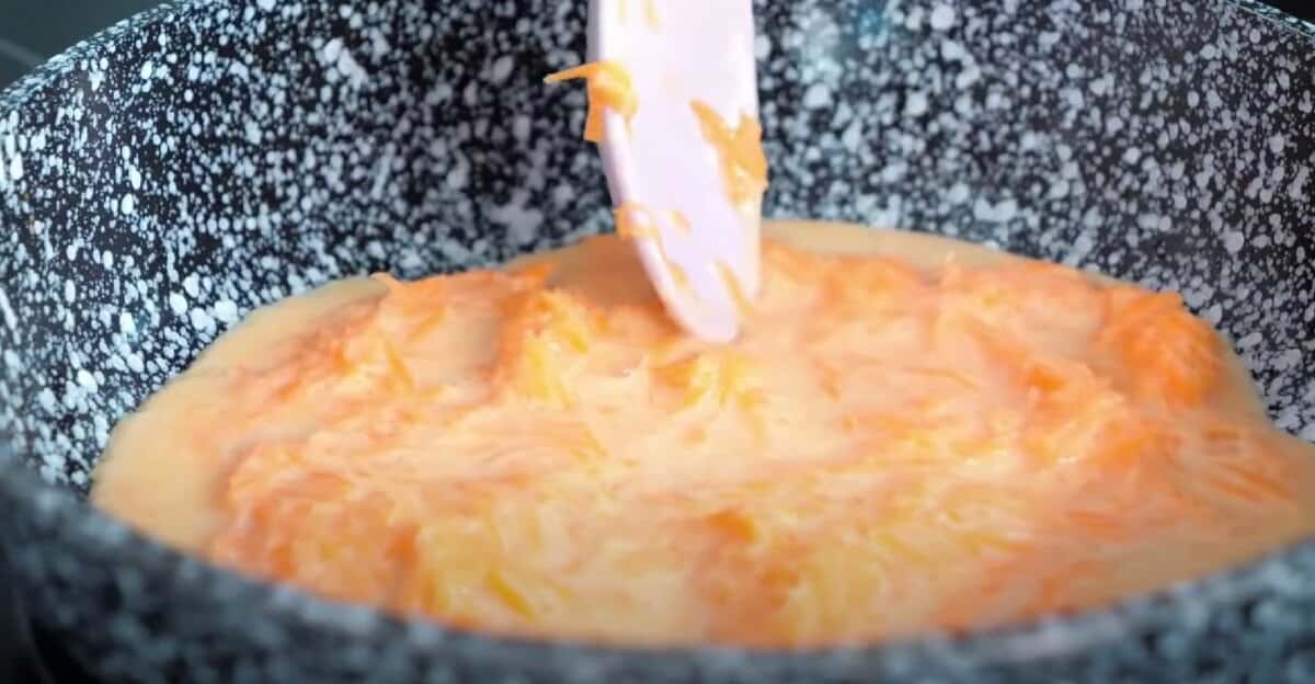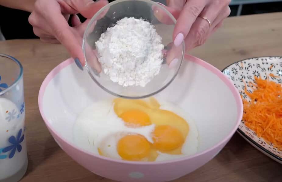 Яйця з’єднуємо з молоком і крохмалем, збовтуємо вінчиком, солимо і вливаємо олію. Далі перекладаємо туди моркву і ще раз добре перемішуємо.