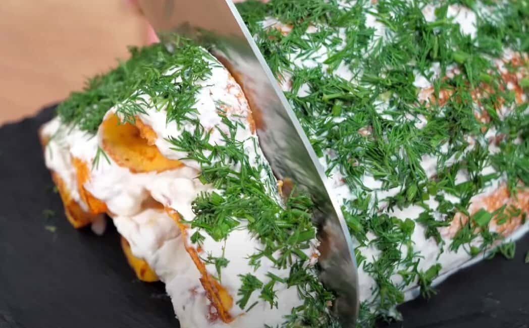 Зверху присипаємо тортик дрібно-порізаним кропом і даємо настоятися пару годин.