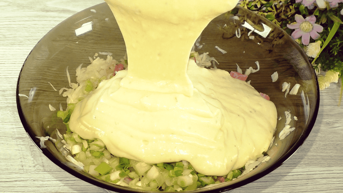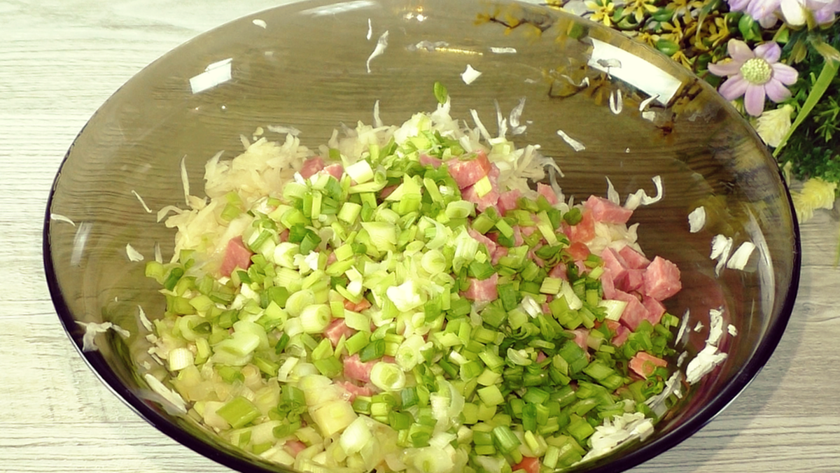 Також додала ковбасу і зелену цибулю. Наповнення за вашим бажанням, можна ковбасу не додавати.