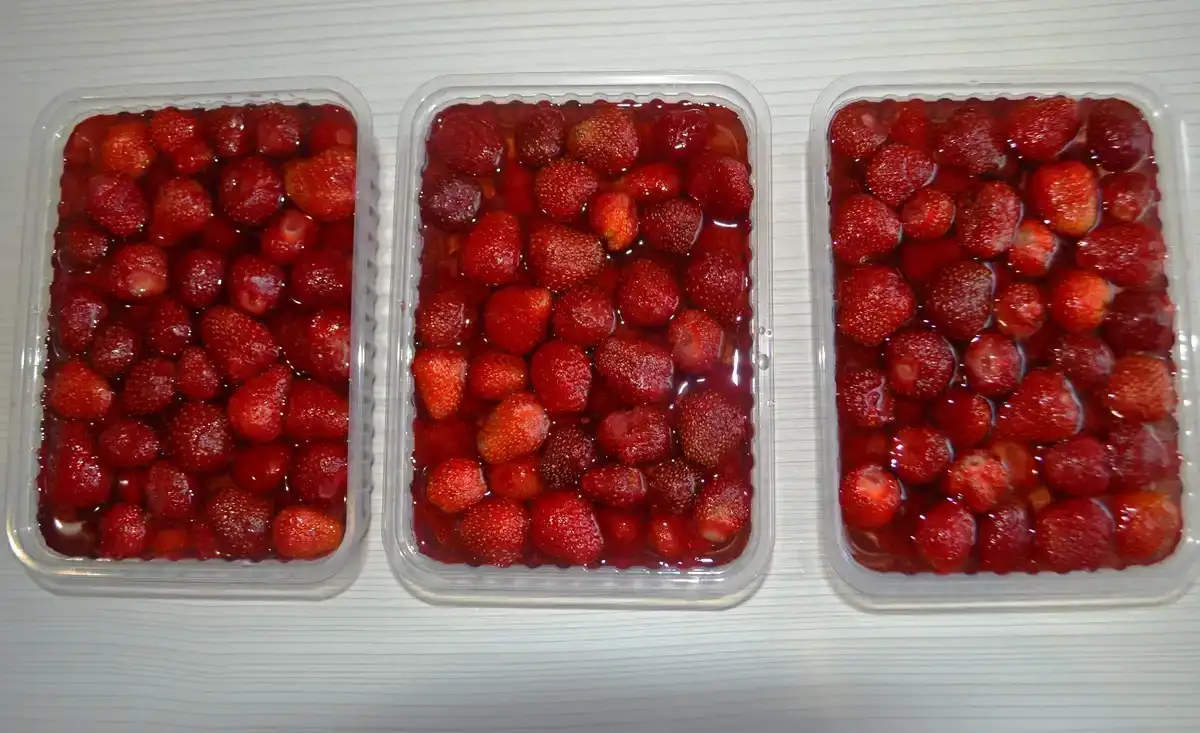 Промиту полуницю викладаю в контейнери, потім заливаю полуничним пюре.