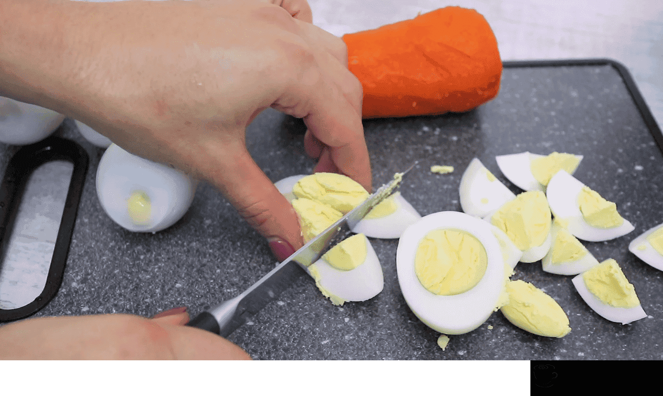 - 5 варених яєць нарізаємо на великі шматочки.