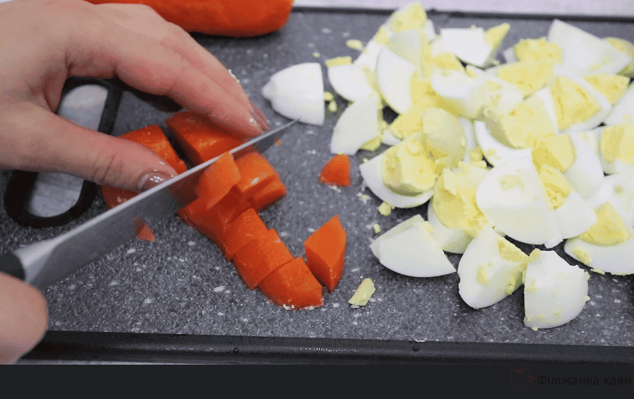 - Варену моркву нарізаємо на невеликі шматочки.
