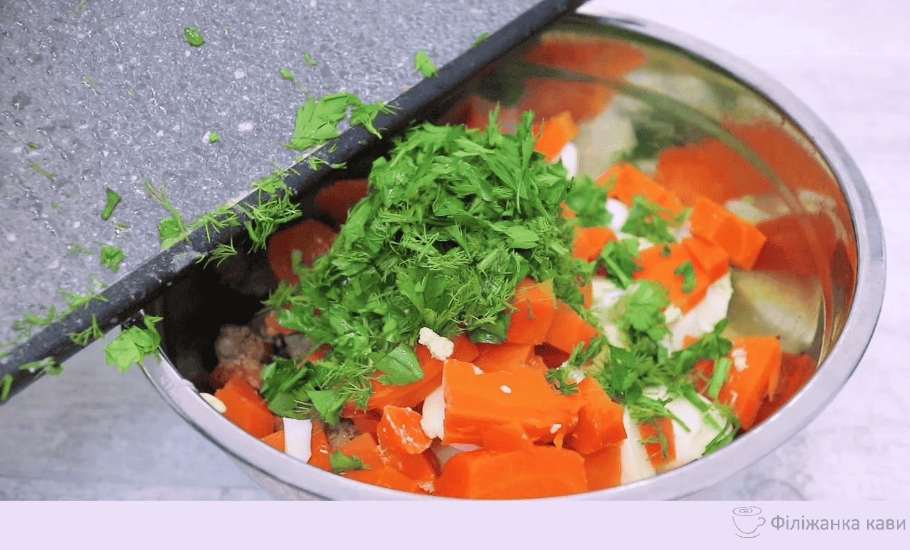 - У чашу відправляємо нарізані яйця, туди моркву і зелень.