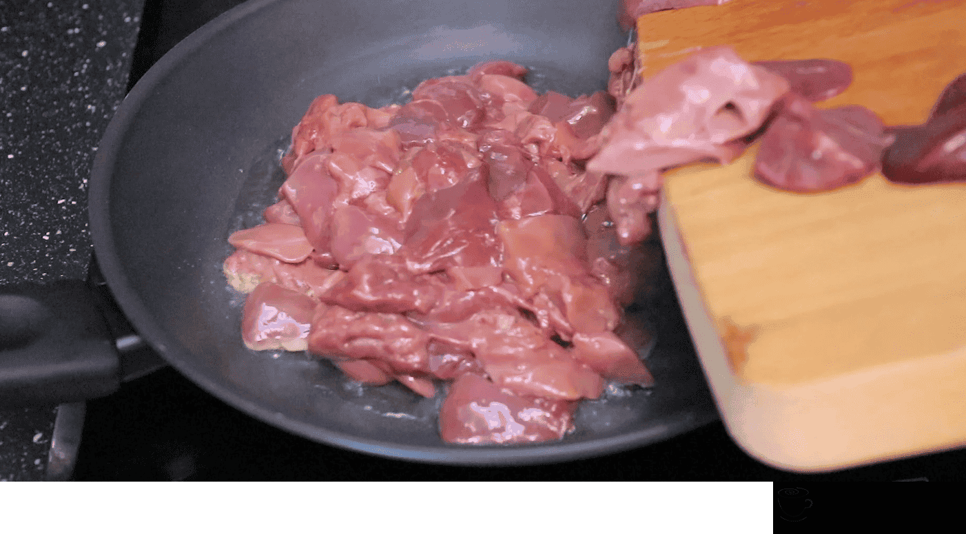 - Курячу печінку промиваємо, прибираємо всі прожилки та нарізаємо на маленькі шматочки. Обсмажуємо печінку на розпеченій сковороді з додаванням олії до освітлення помішуючи, буквально пару хвилин.