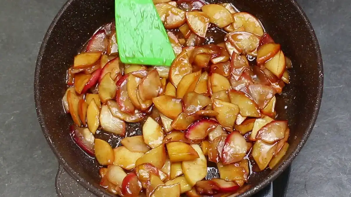 У розігріту сковороду відправляю вершкове масло та нарізані яблука. Перемішую, додаю цукор з корицею та обсмажую хвилин 7-10, щоб розчинився цукор та яблука стали прозорими.
