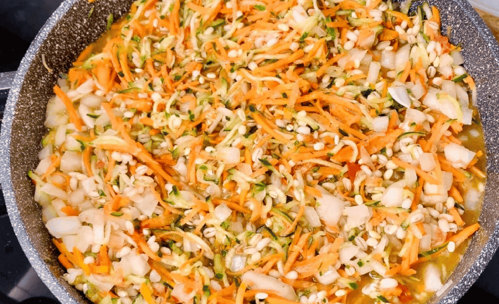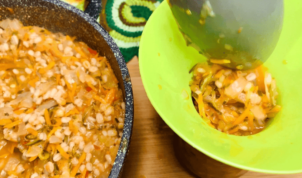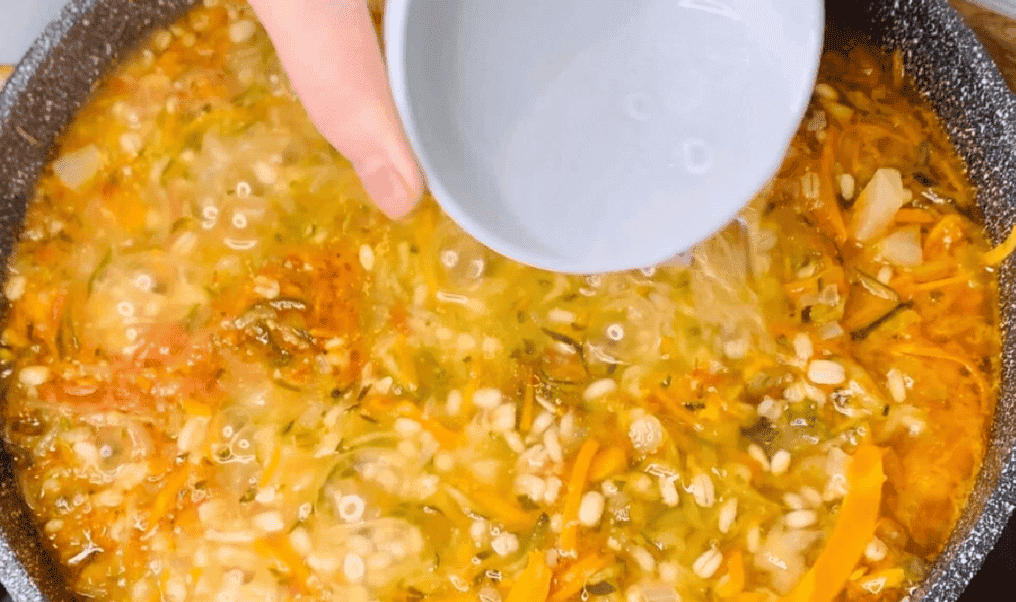 Всипаємо цукор, сіль, вливаємо олію, воду і добре перемішуємо. Потім додаємо терті (або кубиком) огірки, моркву, цибулю дрібним кубиком та перловку. Ще раз перемішуємо, накриваємо кришкою та готуємо з моменту закипання 25 хвилин.