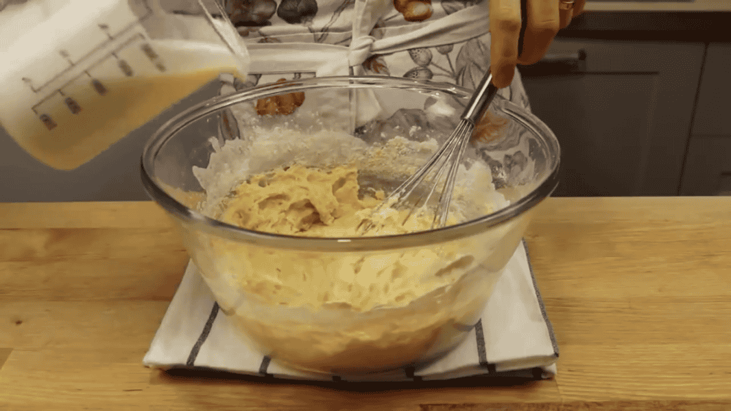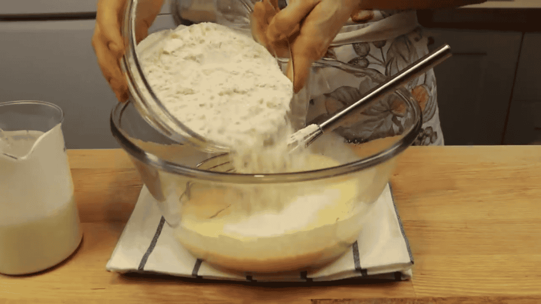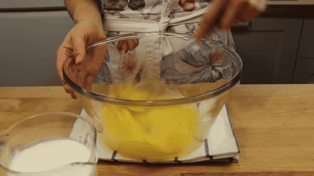 Повинно вийти однорідне тісто, густотою як кефір. Це принцип замішування млинця, потрібно зробити спочатку густе тісто, а потім довести його до потрібної консистенції. Тоді жодних грудочок.