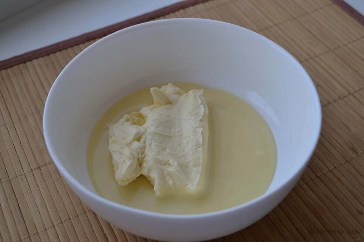 Отже, в першу чергу збиваємо блендером кімнатної температури згущене молоко і такої ж температури вершкове масло, а потім отриману масу прибираємо в холодильник.