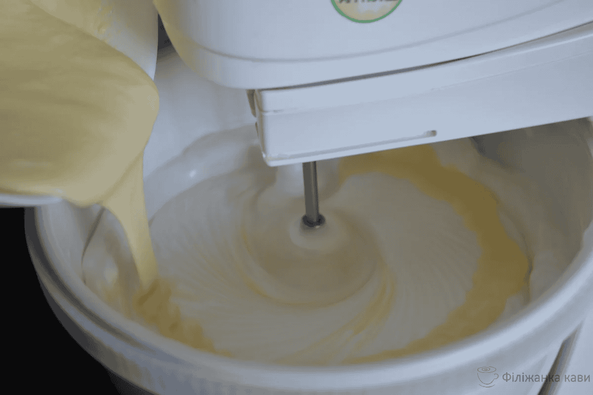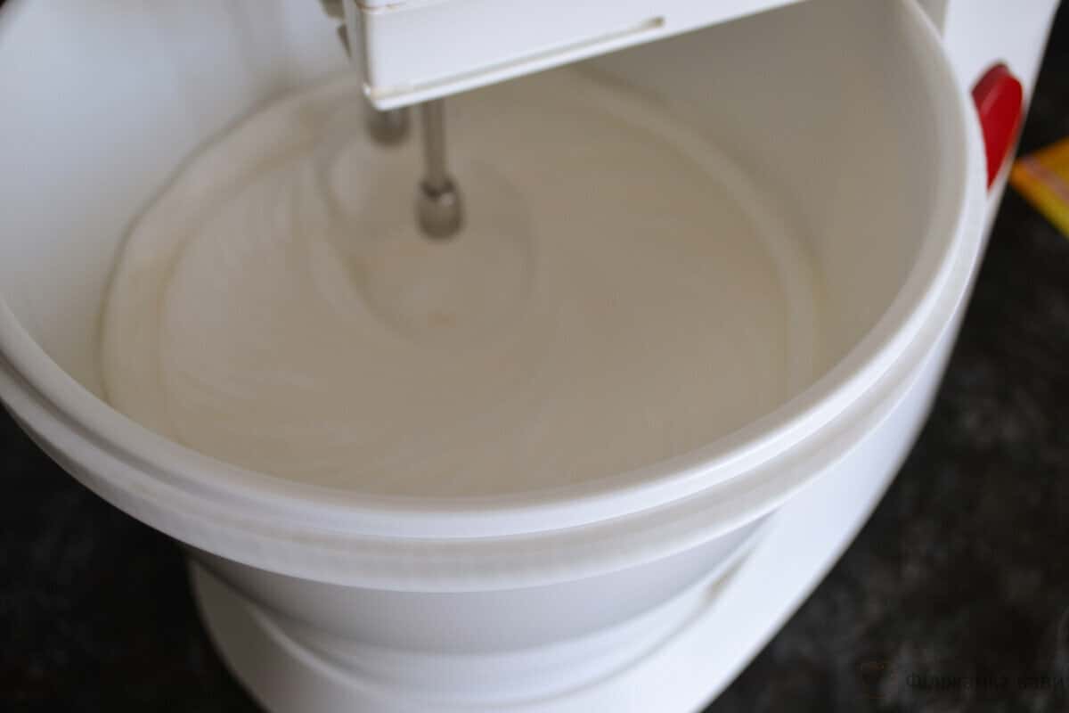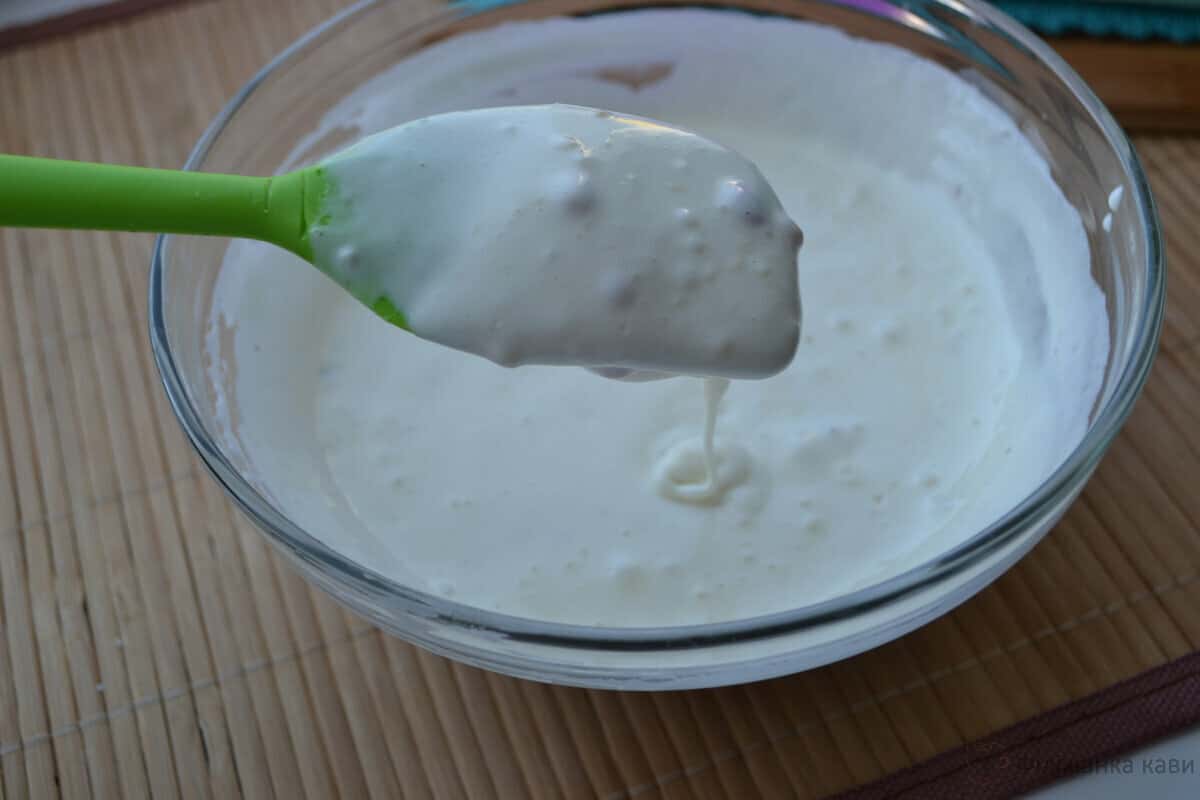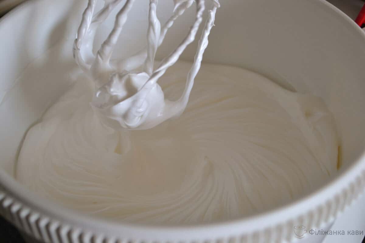 Отже, повернемося до білків, детально покажу як їх приготувати. Спочатку збиваємо білки до білих пишних піків, а потім в три прийоми додаємо цукор. Коли цукор з желатином розчиняться, тонкою цівкою додаємо їх у збиті білки, після додаємо масляно – згущену масу, в завершенні ванільний цукор ( можна обійтися без нього ). Потім вийшлу масу потрібно на око розділити на три частини.