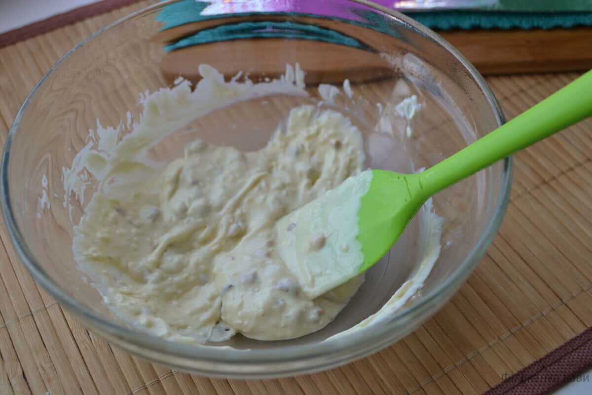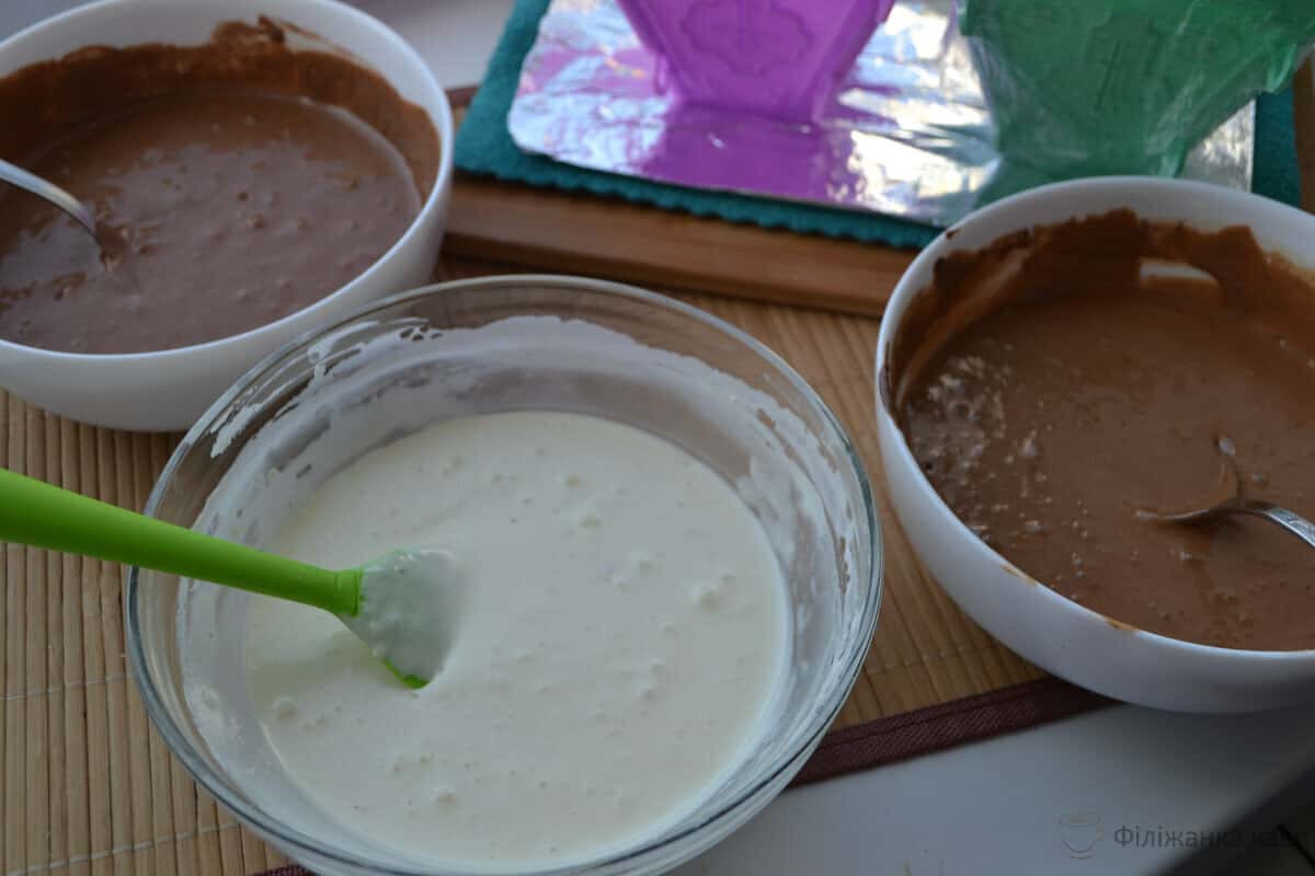 Шоколад розтанув, додаємо в нього 1/3 вийшлої маси, добре перемішуємо. Так потрібно зробити з усіма трьома плитками шоколаду.