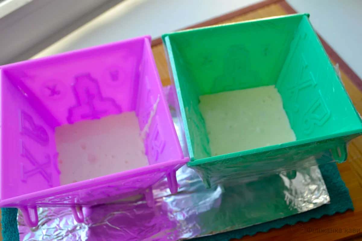 Розливаємо готову суміш в формочки. Першим шаром білий, прибираємо на 10 хвилин в холодильник, потім другий кавовий шар і знову на 10 хвилин в холодильник, після третій. Можете не переживати, за цей час маса, так яка чекає своєї черги не встигне застигти в чашках- перевірено.