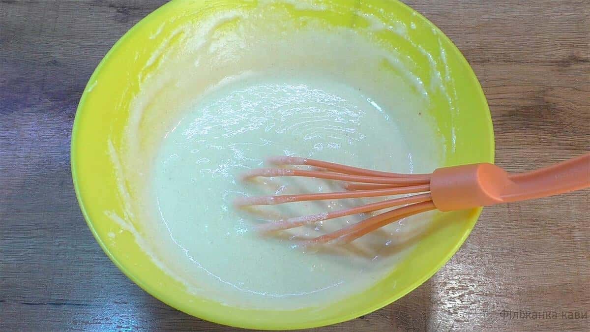 У миску розбиваємо 2 яйця, додаємо 1/3 ч. л. солі і 1 стакан цукру. Перемішуємо вінчиком. Стакан використовуємо 200 або 250 мл. Потім вливаємо 1 стакан кефіру, після чого 1 стакан борошна, 1 стакан манної крупи і 1 ч. розпушувачу. Все перемішуємо вінчиком до однорідності.