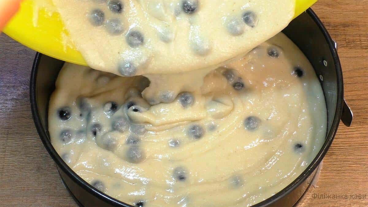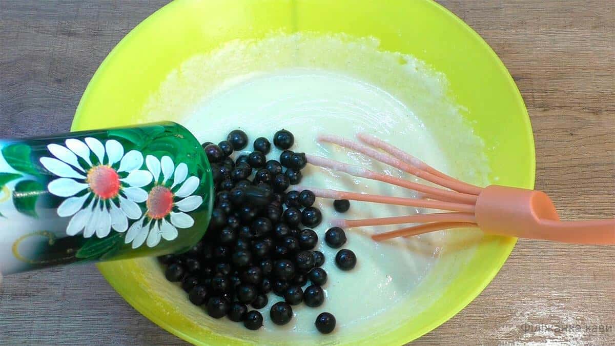 В кінці вливаємо півсклянки олії і ще раз перемішуємо. Можна дати тісту настоятися 15 – 20 хвилин, щоб манка набрякла або випікати відразу. У тісто висипаємо стакан будь-яких ягід – у мене це чорна смородина.