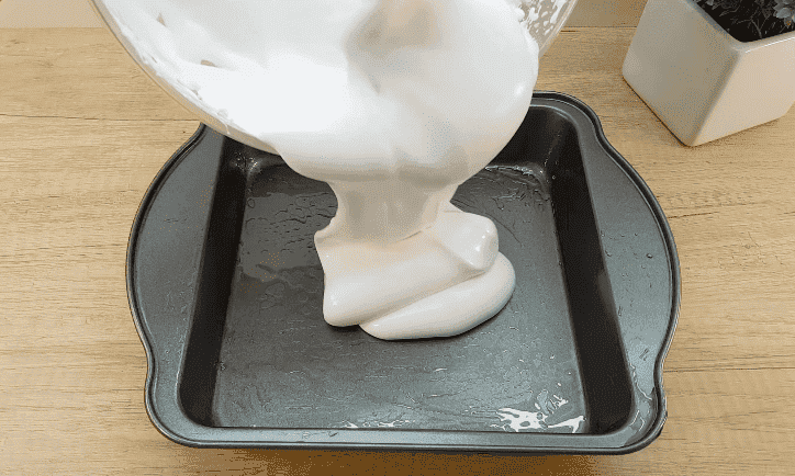 Як тільки суміш стане білою і в’язкою, відразу лийте у форму 1/2 частини