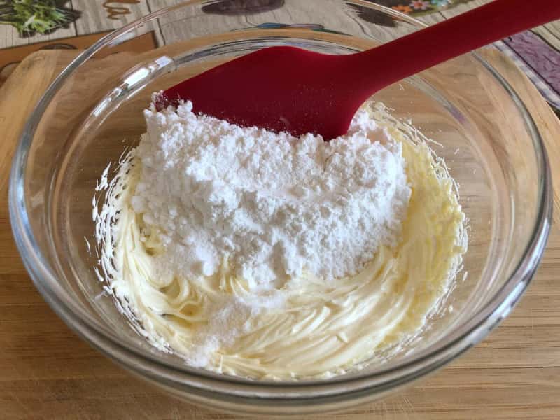 У миску додаємо розм’якшене вершкове масло і цукрову пудру і перетираємо лопаткою.