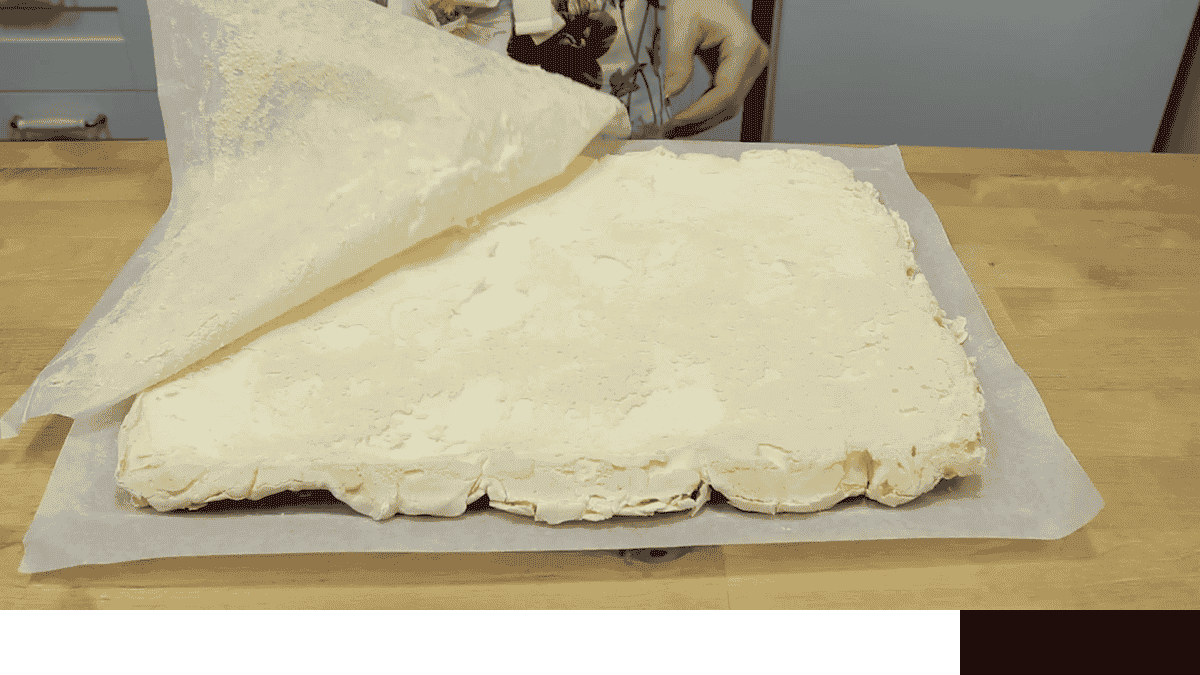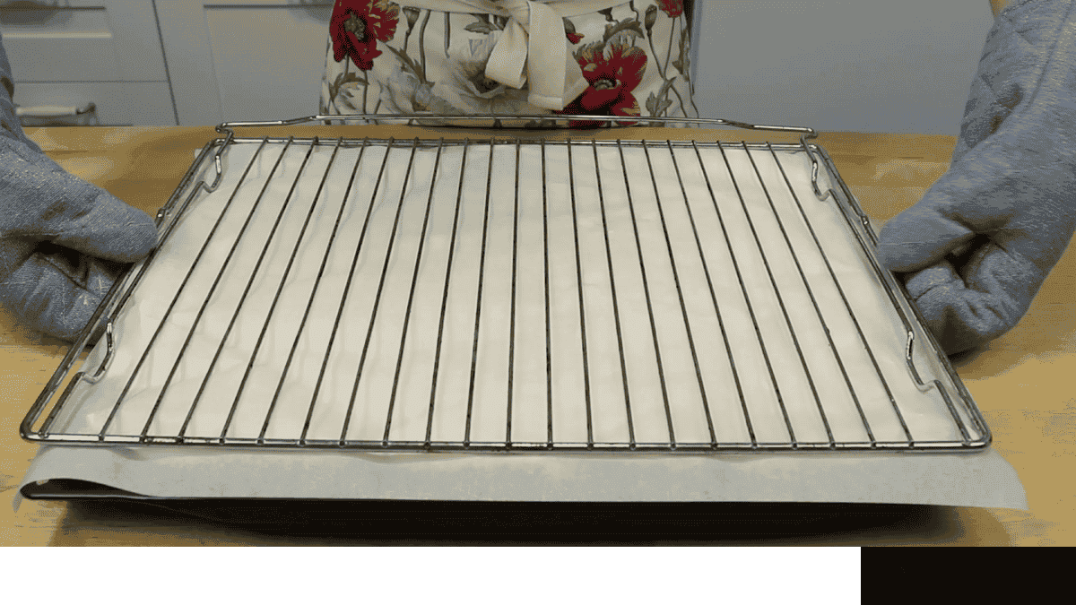 Деко потрібно відразу вийняти з духовки. Зверху лист пергаменту і решітка. На неї перевертаю меренговий корж.
