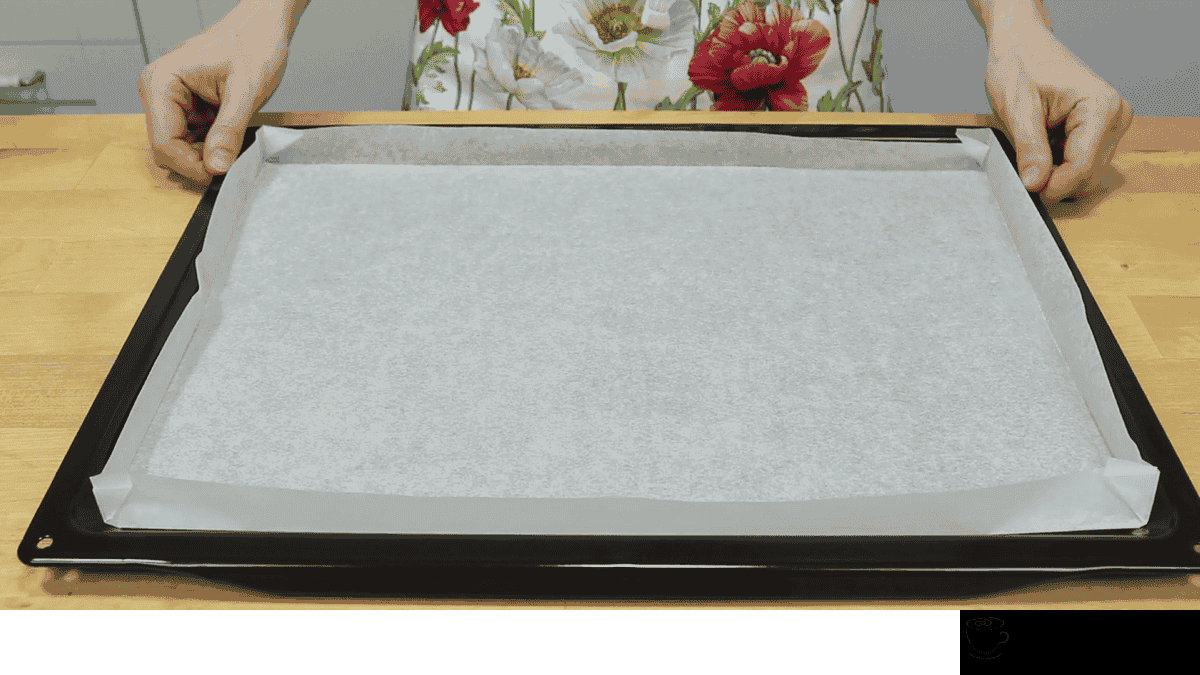 Відразу потрібно підготувати деко. У мене стандартне розміром 30 * 40 см. Застелила його пергаментним папером. Пергамент повинен бути якісним, силіконізованим.