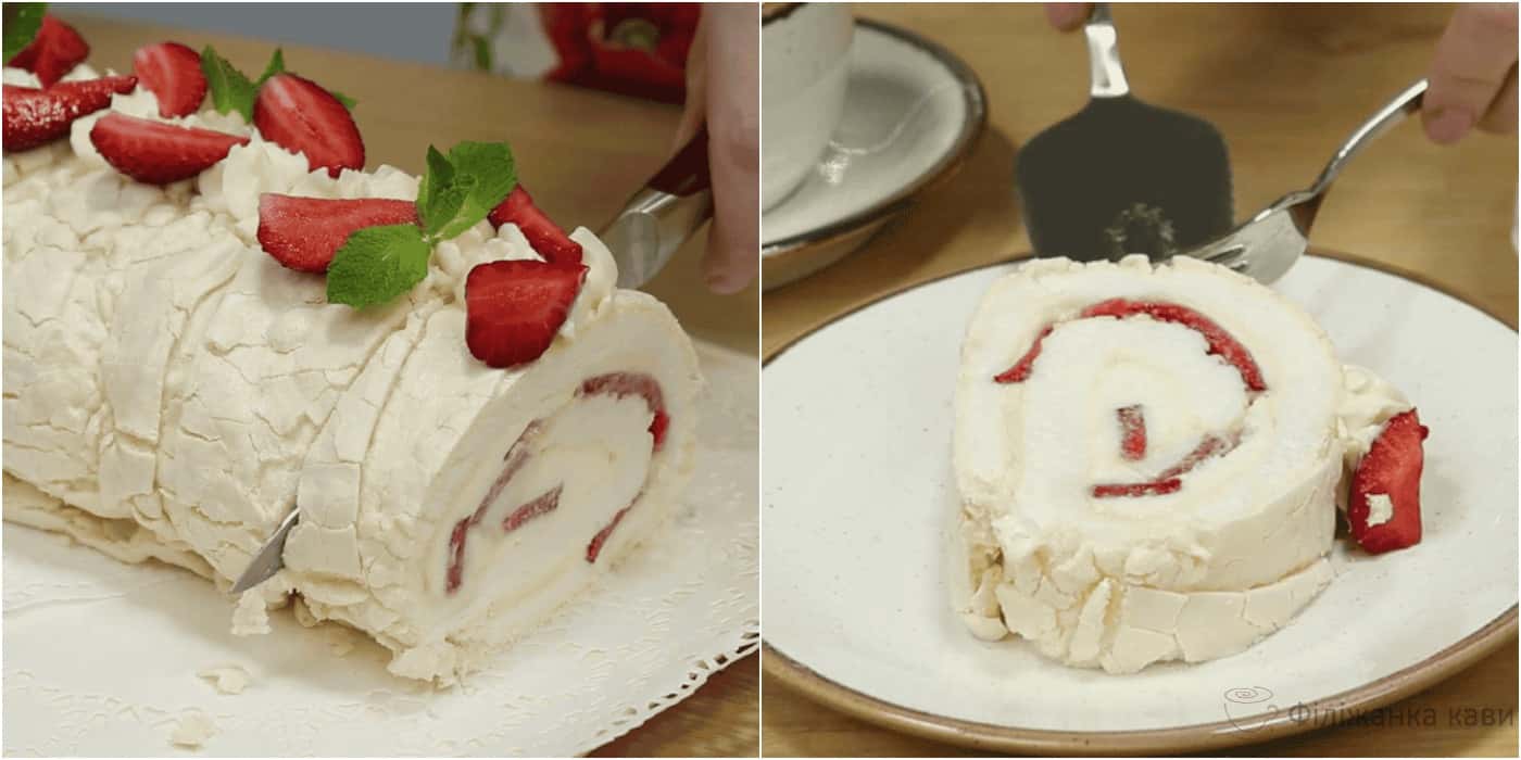 Готую меренговий рулет – пишний, вишуканий десерт, влітку можна експериментувати з різними яодами, добре підійде полуниця або малина. Такий не десерт можна подати і на святковий стіл і просто для домашнього чаювання.