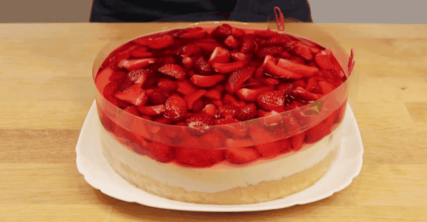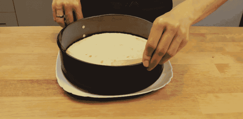 Бісквіт переношу на тарілку, зверху ставлю кільце для збирання торта, або борти від форми в якій випікався бісквіт. Бортики закриваю плівкою чи пергаментом.