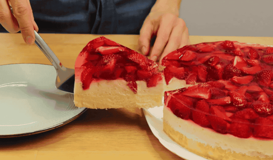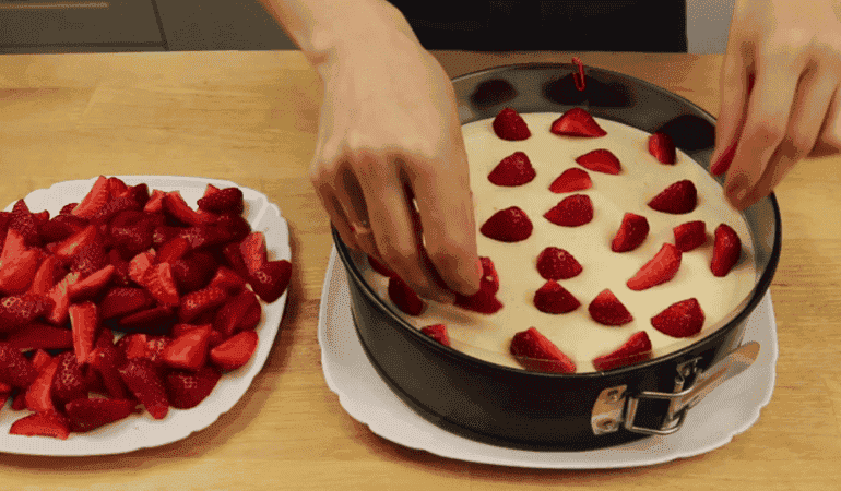 Половину полуниці акуратно втискаю в крем, щоб шари пирога не розділилися. Решту викладаю зверху.