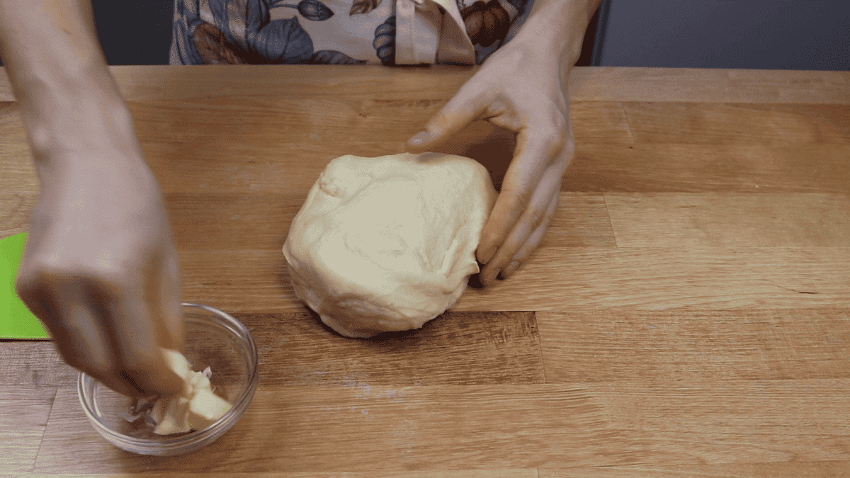 Тепер вмішую м’яке масло. Тісто можна замісити і в планетарному міксері, як і будь-яке інше дріжджове тісто.