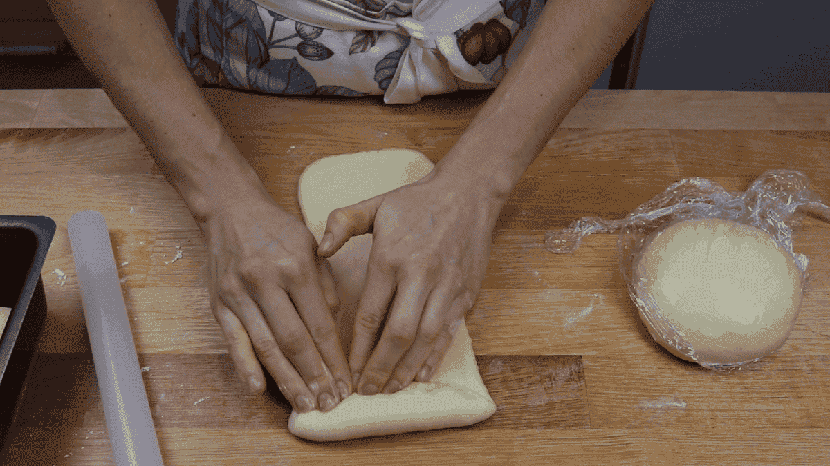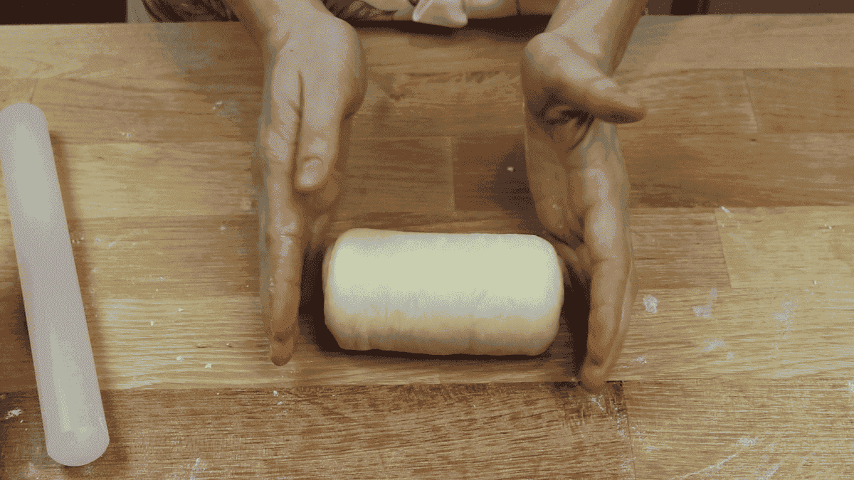 Повертаю тісто і розкочую качалкою в прямокутний пласт товщиною 5 – 7 мм.