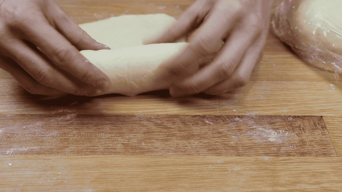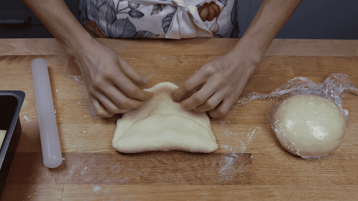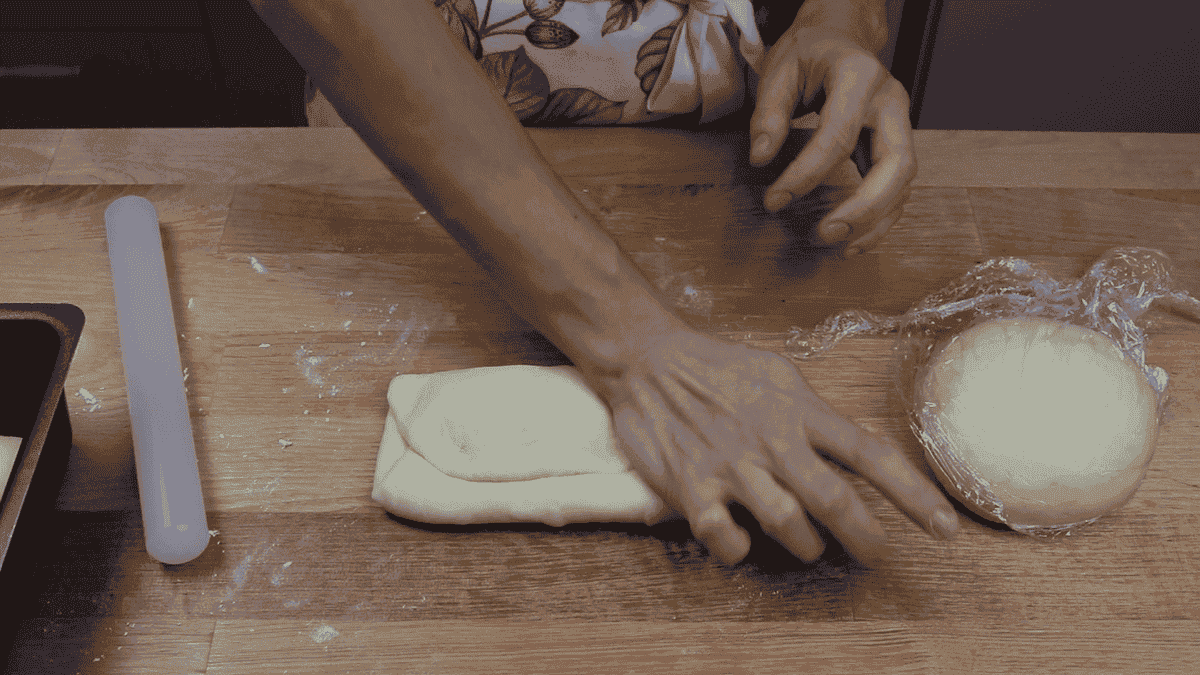 На столі присипаному борошном розкочую одну кульку тіста в пласт товщиною 7 -10 мм. Складаю конвертом і притискаю рукою.