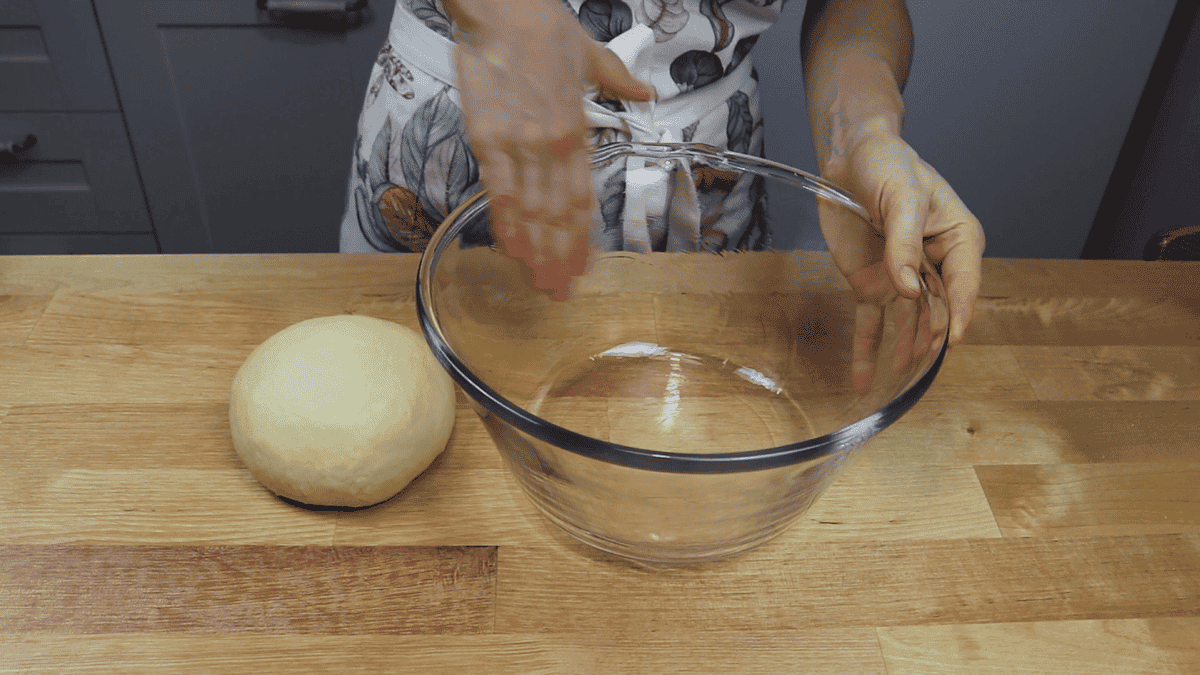 Кладу його в миску змащену олією, накриваю і залишаю підніматися на 1 -1,5 години. Тісто збільшиться в 3 рази.