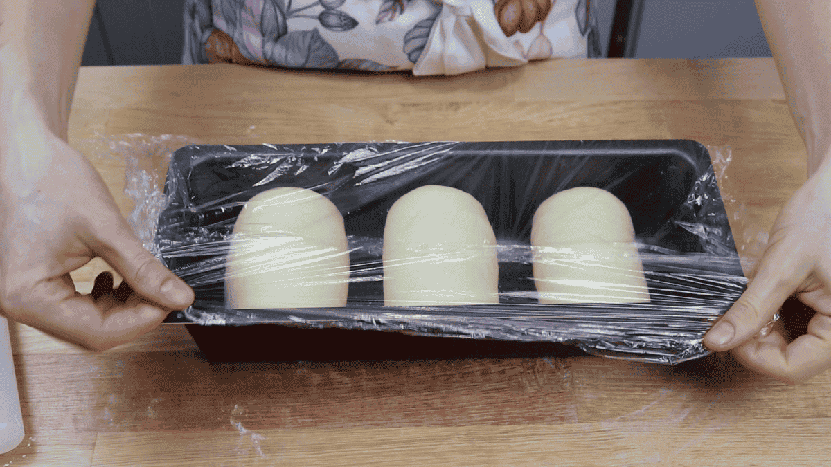 Укладаю в форму на відстані один від одного, тісто добре збільшується в обсязі. Залишаю підніматися на 1 – 1,5 години. Сильно плівку не натягую, так як тісто буде підніматися вище форми.